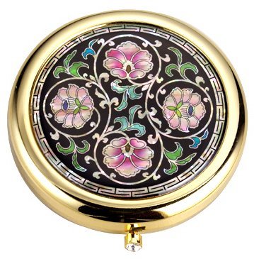This gold plated compact case with mother of pearl inlaid has mirror attached underneath the lid, extra inner flip cover to stop powder flying out, and sponge inside the compact case. Natural shimmering natural mother of pearl inlaid in the pattern of oriental imaginary flowers with swirling twine in the black background. Press the diamonte knob to open. For pressed powder refill, refill case should be smaller than diameter 2.1" (5.2cm) and depth 0.2" (0.5cm) to fit in. The compact case comes in a nice gift box - ideal for gift. Size : Diameter 7cm (2.8"), Thickness 1.5cm (0.6")..... See more details and check price update please